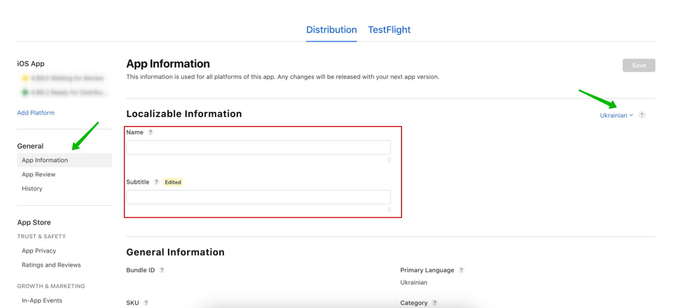 3. Select the desired languages from the “Not Localized” list, then fill in the Name and Subtitle fields.