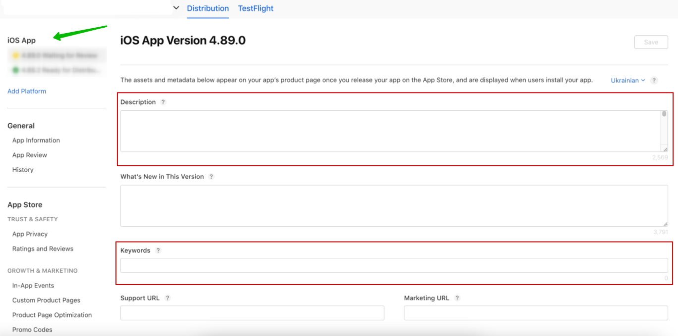 4. In the new release version, add localized text metadata — description and keyword list — to the appropriate fields.